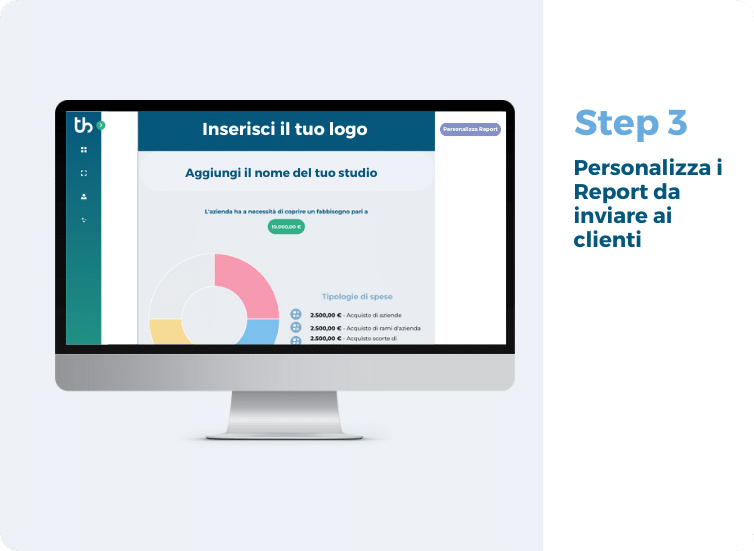Prima di scaricare il report in PDF contenente tutte le agevolazioni migliori per i tuoi clienti, potrai personalizzarlo inserendo il logo, i colori ed il nome del tuo studio professionale. In questo modo nessuno si accorgerà che dietro ad un lavoro così ben fatto c’è la mano di Trovabando, e potrai offrire un prodotto personalizzato ai tuoi clienti.